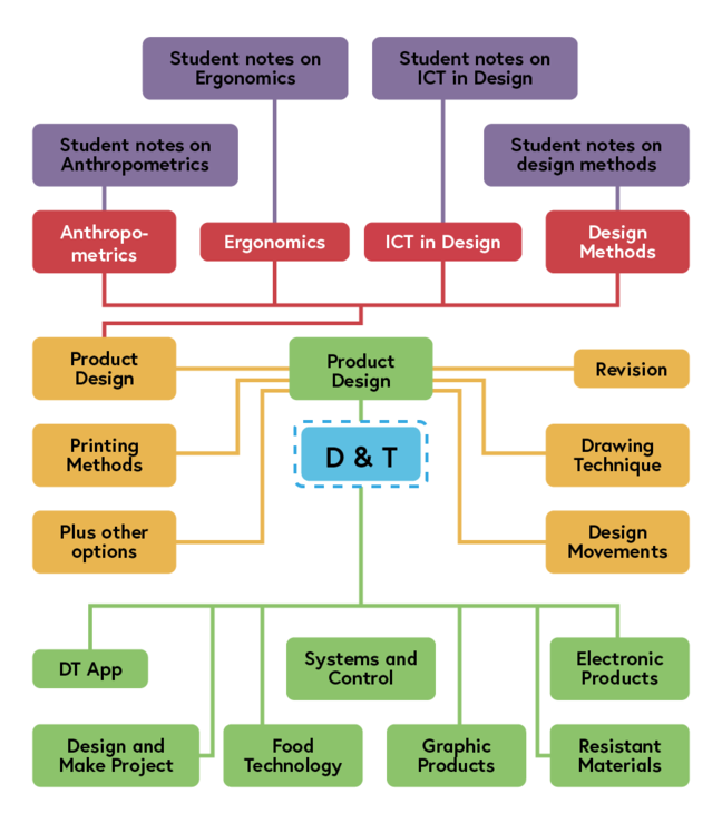 En algunos aspectos, la aplicación funciona como un libro porque tiene muchas páginas. El mapa conceptual a continuación muestra el diseño de la aplicación. Simplifica las conexiones entre las páginas. La aplicación D&T abre inicialmente una página con secciones (por ejemplo, Diseño de producto, Sistemas y control, Productos gráficos). Cuando se selecciona una de estas secciones, se abre una página con subsecciones (por ejemplo, Movimientos de diseño, Métodos de impresión, Diseño de producto). Asimismo, cuando se selecciona una subsección, se abre una página de temas que se conectan con las notas de los estudiantes (por ejemplo, ergonomía, TIC en el diseño, métodos de diseño).